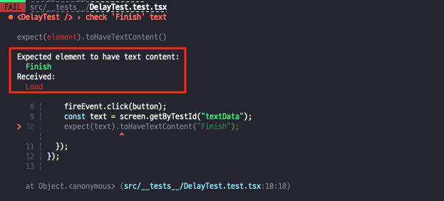 간단한 예로 렌더링 된 후 2초가 지났을 때 화면에 title이 “Load”에서 “Finish”로 변경되는 화면이 있다고 합시다. 이 화면에 테스트 코드를 단순히 render후 Finish text를 찾는다면 에러가 발생합니다. 당연하죠. 변경하기 위해서는 2초에 시간이 필요하지만 테스트 코드는 동기적으로 진행하기 때문에 실행되는 과정에서는 text변경이 없습니다. ( 코드 예시는 아래에서 작성하겠습니다. )